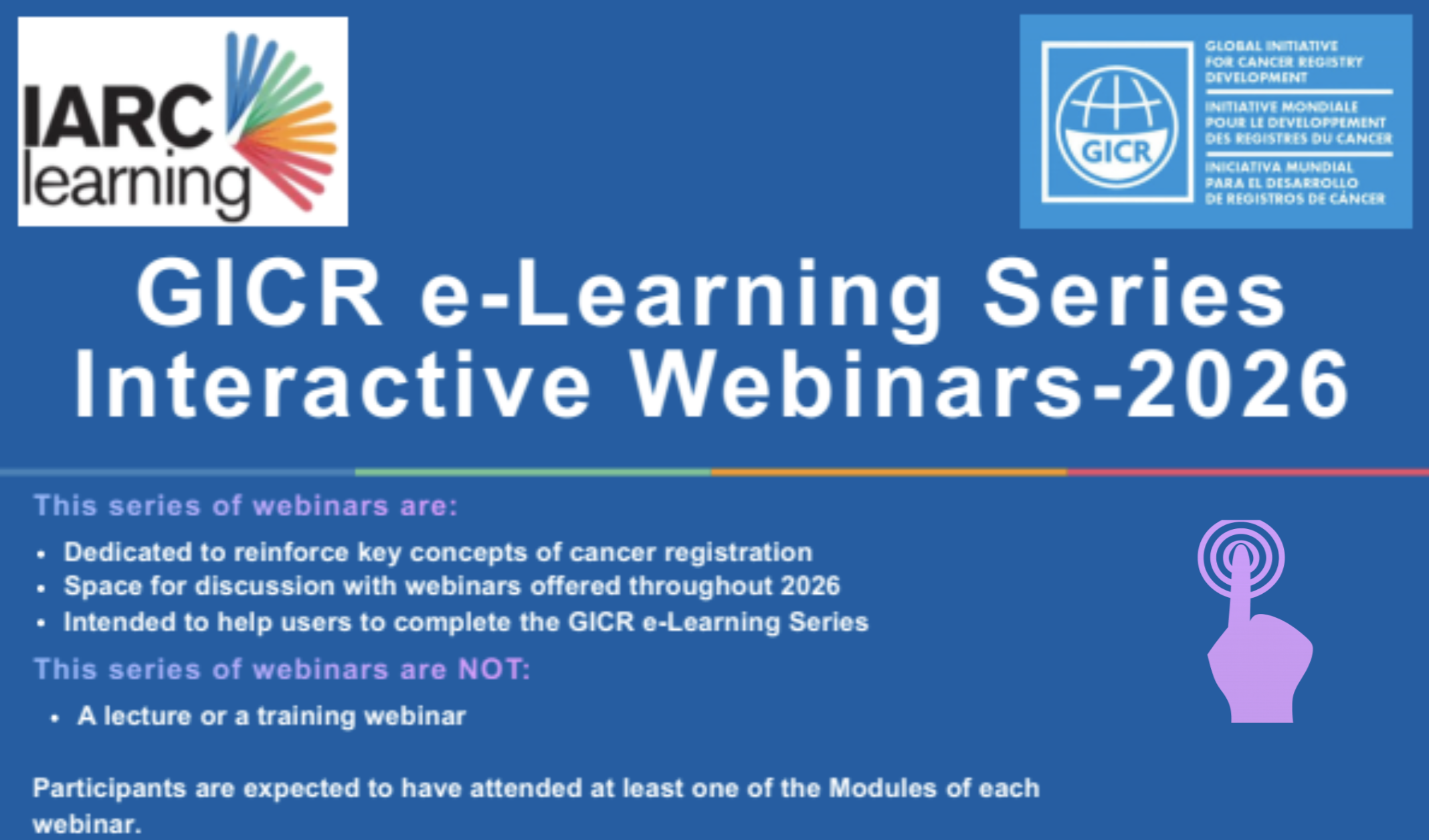 The International Agency for Research on Cancer (IARC), through the Global Initiative for Cancer Registry Development (GICR) and its worldwide network of trainers, is pleased to announce the launch of the e-Learning Series Interactive Webinars 2026. These live sessions will take place throughout the year, with specific dates to be announced by each GICR Hub.